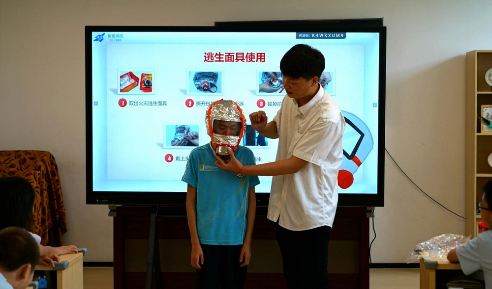 隨后,依愛(ài)消防的志愿者彭啟晗為孩子們帶來(lái)了一場(chǎng)生動(dòng)、活潑的消防安全知識講座,從教小朋友認識消防器材、消防標識到如何使用消防設備、預防火災、逃生等,淺顯易懂的語(yǔ)言讓孩子們很快就能夠掌握這些應知應會(huì )的消防安全知識,邊學(xué)邊互動(dòng)的有獎回答讓小朋友們踴躍發(fā)言,課堂氣氛非?;钴S。在防煙防毒面具、防火毯和滅火器的演示、使用動(dòng)手環(huán)節上,孩子們爭先恐后、躍躍欲試。有些小朋友因為身體殘疾的原因雖然不能夠去動(dòng)手實(shí)踐,但在講課環(huán)節時(shí)非常認真地聽(tīng)講,對于不懂的問(wèn)題還積極提問(wèn),志愿者老師也耐心的講解。一個(gè)多小時(shí)的課程和互動(dòng)很快就過(guò)去了,孩子們依依不舍,禮貌的道別。